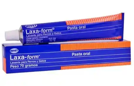 ACCIÓN: Laxante, lubricante INDICACIONES: Laxante para Perros y Gatos. OTROS USOS: En Gatos como laxante y lubricante para prevenir y remover bolas de pelo. Es particularmente conveniente su uso después de cirugías ano rectales y genito urinarias para reducir el pujo perjudicial. DOSIS: Uso oral. La dosis se puede suministrar por medio de una cucharadita dulcera, que equivale a 6 gramos. Para bolas de pelo: Gatos: De 3 a 6 g por 2 a 3 días, luego de 1,5 a 3 g dos a tres veces por semana. Como laxante: Perros: De 3 a 6 g, 2 a 3 veces por semana. Gatos: De 1,5 a 3 g, 2 a 3 veces por semana. Estas dosís pueden variar según criterio del Médico Veterinario. SUGERENCIA PARA SU USO: Coloque una pequeña cantidad de LAXA-form en la nariz o en la pata del animal para estimular el interés y el gusto hacia el producto. Las mascotas lo aceptarán ahora sin reserva.