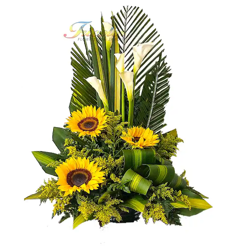 3 Girasoles 4 follaje variado 1 Flor de complemento ( Aster o Solidado). 3 Follaje variado Hojas de Balazo 3 Follaje variado Hojas de Lino 0,25 Follaje variado (Dracena) 5 Calas 1 oasis doble 1 Base de vidrio pl6