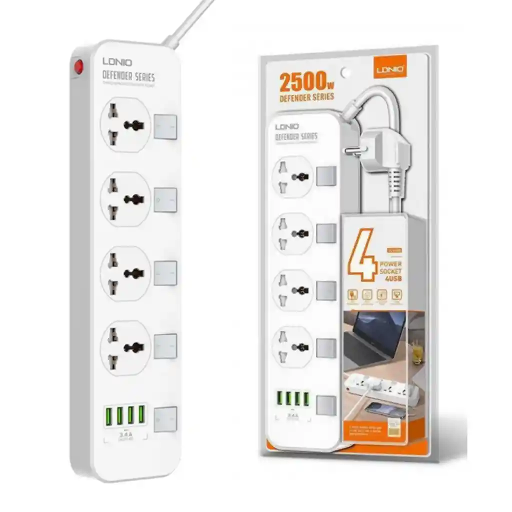Multitoma tipo regleta LIDNIO, con 4 tomas corrientes o enchufes y 4 puertos USB carga rápida Dimensión: 28 cm largo x 6 cm ancho x 3 cm Material:: PC y ABC retardante de fuego Largo del cable: 2M Voltaje nominal: 250 V Potencia nominal: 2500 W