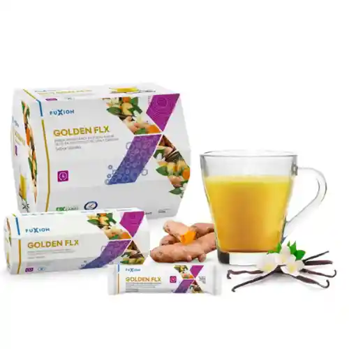 Fusión Nutracéutica: Extracto de Curcuma orgánica certificada y patentada (Turmipure) + Extracto de Jengibre (Kión) + Cardamomo + Leche de Coco + Pimienta Negra + Canela Golden Flx es la nueva y deliciosa bebida funcional de Fuxion inspirada en el tradicional ponche de cúrcuma y especias “Golden Milk,” para ayudar a mejorar la movilidad y flexibilidad articular. Fuxion rescata esa deliciosa receta y la mejora y potencia. Mejora la movilidad y flexibilidad de las articulaciones. Mejora la digestión de los principios activos. Es un poderoso desinflamante natural. EXTRACTO DE CÚRCUMA + EXTRACTO DE JENGIBRE + CARDAMOMO + LECHE DE COCO + PIMIENTA NEGRA + CANELA Golden Flx es la nueva y deliciosa bebida funcional de Fuxion inspirada en el tradicional ponche de cúrcuma y especias “Golden Milk,” para ayudar a mejorar la movilidad y flexibilidad articular. Fuxion rescata esa deliciosa receta y la mejora y potencia gracias a la combinación de Extracto de cúrcuma orgánica estandarizado en curcuminoides), en sinergia con el Jengibre y Cardamomo, especies de la misma familia utilizados durante milenios por la medicina India y China para el alivio de inflamaciones, dolores y prevención de enfermedades. Además, incorpora leche de coco y el extracto de pimienta que han demostrado ser excelentes digestivos y gracias a esto favorecen la asimilación de los nutrientes para una mejor biodisponibilidad Beneficios Los ingredientes de Golden FLX trabajan en sinergia para: - Contribuir a prevenir problemas articulares ocasionados por la edad, el sobrepeso y el ejercicio. - Contribuir a mejorar la flexibilidad y movilidad de articulaciones, gracias a la acción de Turnipure®, el súper extracto puro de curcuminoides avalado por estudios clínicos que demuestran sus propiedades. - Ayudar a controlar los procesos oxidativos. Presentaciones Golden FLX Grande: 28 sachet