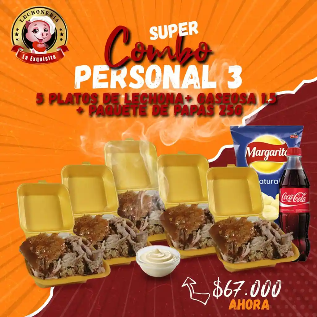 5 platos de lechona de 300 gm una gaseosa 1.5 coca cola más un paquete de papas margarita de 25 gm