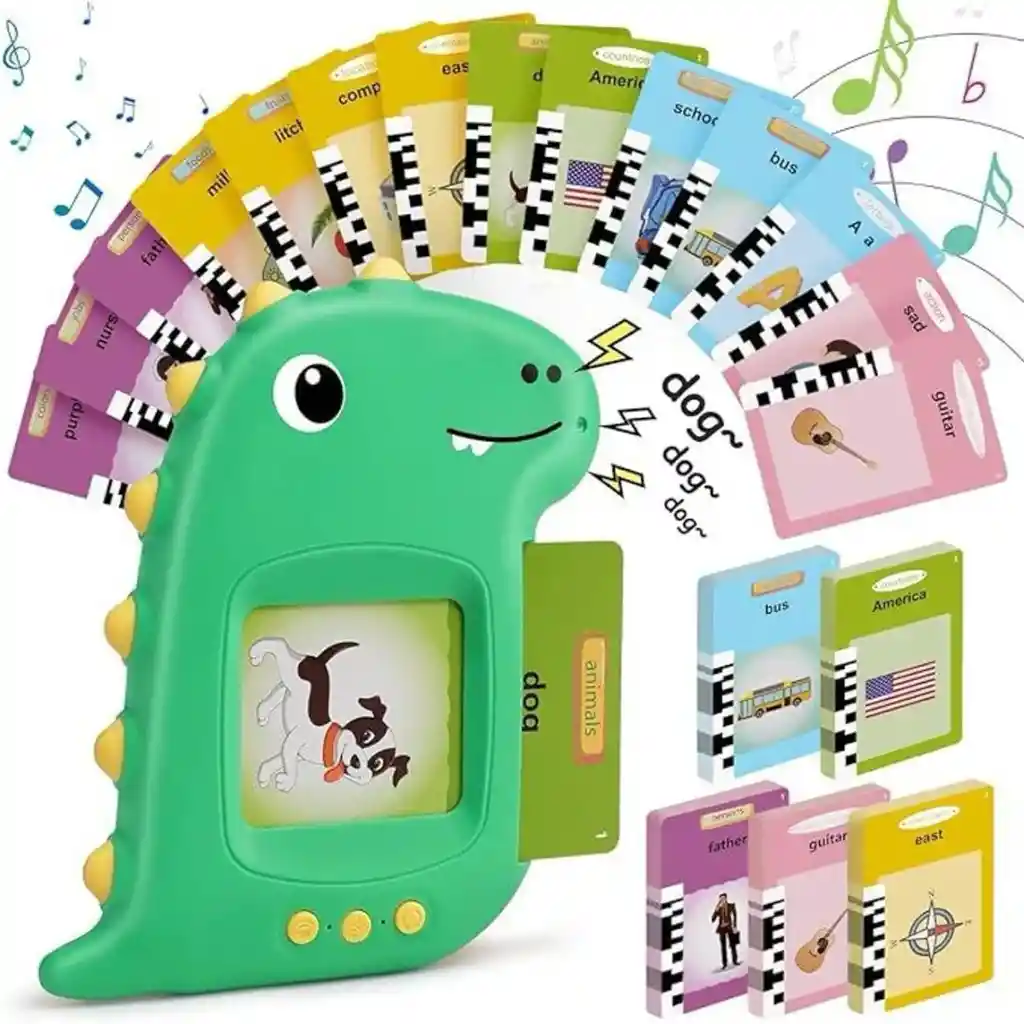 Increible juego de aprendizaje con 224 palabras con imagenes y sonidos para aprender jugando. Super liviano, facil de usar y lo mejor de todo es Recargable via USB. Incluye cable Micro USB-USB para cargar el dispositivo. Para que funcione hay que meter la tarjeta en la ranura de costado y emite por el parlante de atras el sonido en español y en ingles del item mostrado en la pantalla del dinosaurio y en el caso de los animales tambien su sonido particular (por ejemplo el leon su rugido). El dispositivo tiene forma de dinosaurio y tiene 3 botones: boton izquierdo: volumen tiene varios niveles de volumen. Boton del medio prender/apagar apretando unos segundos el boton. Boton derecho: Repetir sonidos de la tarjeta insertada. Las cartas vienen divididas por colores en tematicas y guardadas en dos mazos ( A y B ). Medidas: Dinosaurio: Alto: 13,5 cm, Ancho: 9,5 cm, Prof: 2 cm