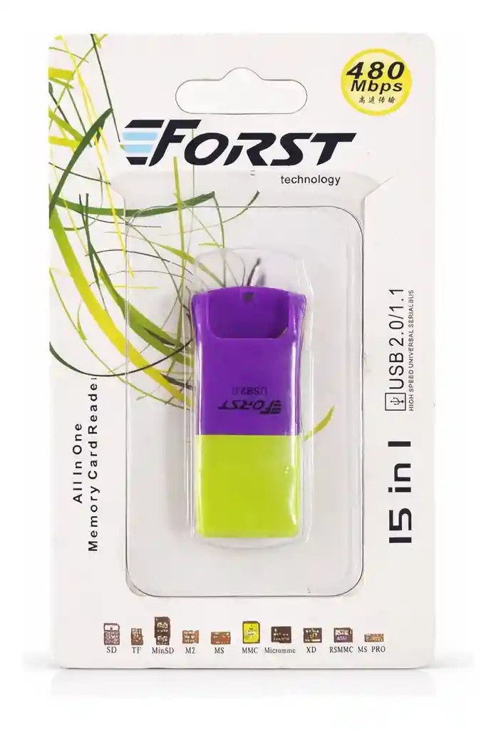 🛒 ¡Bienvenid@ a Disho! Tu tienda digital. 💡 Productos seleccionados para simplificar tu vida. 🚚 Envíos a todo Colombia. Las fotos son de referencia. El color y el modelo pueden variar según disponibilidad, sin afectar las funciones ni la calidad del producto Lector de tarjetas multifuncional Forst 15 en 1 USB 2.0, ideal para transferir datos de manera rápida y segura. ESPECIFICACIONES PRINCIPALES - Compatible con 15 tipos de tarjetas de memoria, incluyendo SD, TF, MS, M2, XD, RSMMC y MS PRO. - Interfaz USB 2.0/1.1 para una fácil conexión a computadores y otros dispositivos. - Velocidad de transferencia de hasta 480 Mbps. DISEÑO Y USO - Diseño compacto y portátil en colores morado y verde. - Fácil de usar: solo conecta y transfiere tus archivos. RECOMENDACIONES - Ideal para fotógrafos, estudiantes y profesionales que requieren transferencias rápidas de datos. - Compatible con sistemas operativos Windows y Mac OS. GARANTIA por defectos de fábrica. No cubre mala manipulación del producto; Todos los costos de devolución por garantía estarán a cargo del comprador. Puedes ver todos nuestros productos en el siguiente link www.disho.co