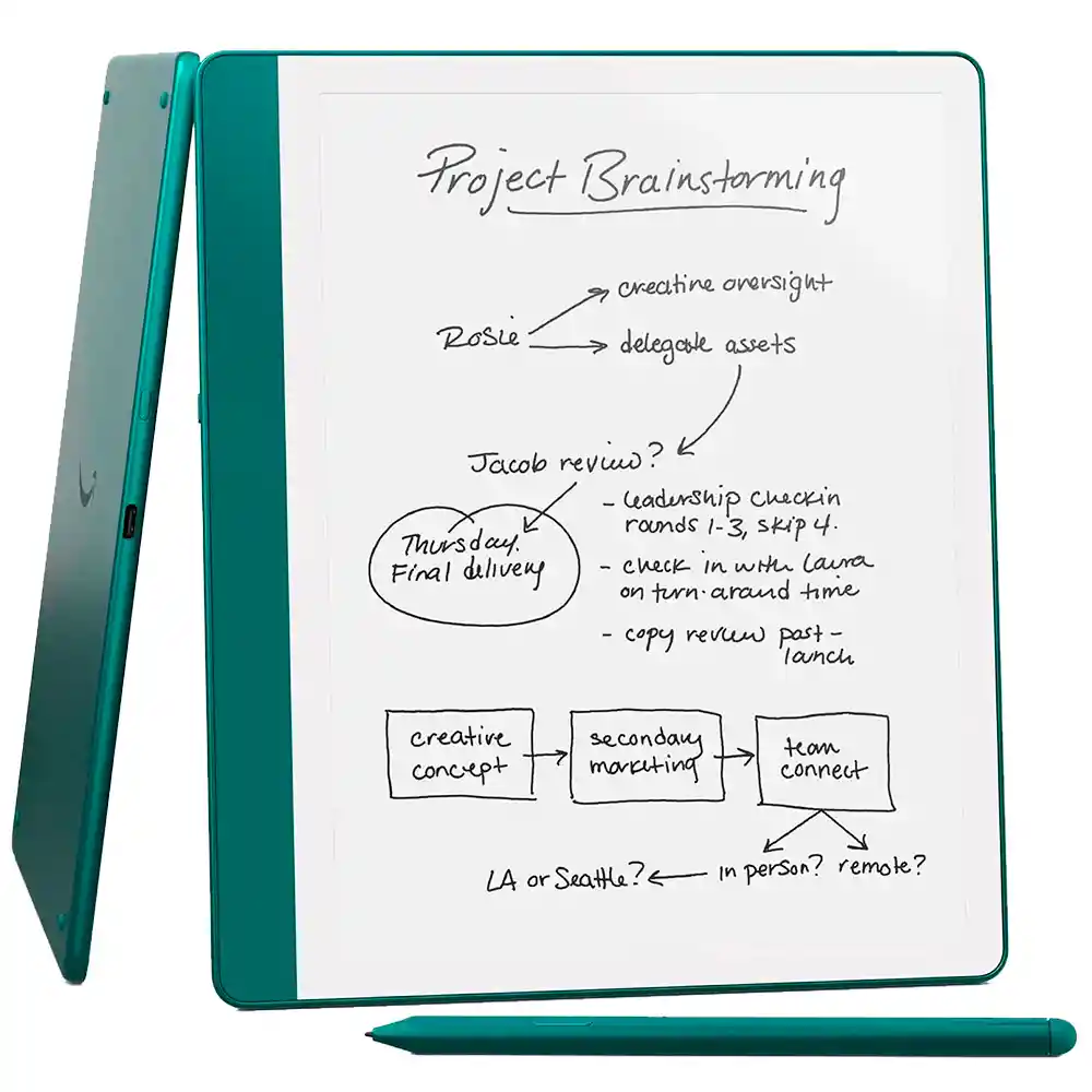 El Kindle Scribe es el primer Kindle para leer y escribir. Su pantalla de 10.2" sin reflejos, 300 ppp y luz ajustable ofrece una experiencia similar al papel. Con Active Canvas puedes anotar en libros y documentos sin alterar su formato. Incluye un cuaderno digital para tomar notas, organizarlas y convertirlas en texto digital. El lápiz prémium, sin carga ni configuración, tiene diseño ergonómico, botón personalizable y borrador. Gracias a herramientas de IA, puedes resumir y refinar tus notas fácilmente. Importa y marca PDFs, escribe en márgenes y mantén todo en un solo lugar. Sin notificaciones ni distracciones, Kindle Scribe combina lectura y escritura en un solo dispositivo versátil. Especificaciones: Pantalla: Tecnología Paperwhite de 10.2" con 300 ppp, luz integrada y escala de grises de 16 niveles. Dimensiones: 196×230×5.7 mm (dispositivo) 162×9×8 mm (lápiz prémium). Peso: 433 g (dispositivo) 17 g (lápiz prémium). Almacenamiento: 64 GB. Conectividad: Wi-Fi 2.4 GHz y 5.0 GHz con seguridad WEP, WPA, WPA2 y WPA3. Formatos compatibles: AZW3 AZW TXT PDF MOBI sin protección PRC (nativo) DOCX DOC HTML EPUB RTF JPEG GIF PNG BMP y AAX (mediante conversión). Accesibilidad: VoiceView para navegación por audio Bluetooth, ajuste de fuente, interlineado y márgenes, inversión de colores. Batería: Hasta 12 semanas de lectura o 3 semanas de escritura por carga (media hora diaria, Wi-Fi apagado, luz a 13). Carga: Completa en 7 horas por USB-C o en 2.5 horas con adaptador de 9 W. Incluye: Kindle Scribe Lápiz prémium Cable USB-C 5 puntas de repuesto y herramienta de sustitución. Generación: 1ª generación, versión 2024. Garantía: 12 Meses