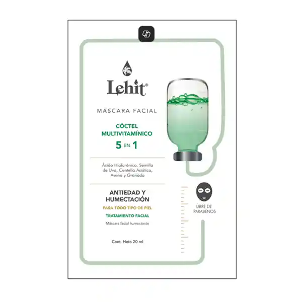 Máscara Facial Coctel Multivitamínico 5 en 1. Antiedad y Humectación. Para todo tipo de piel. Máscara Facial Humectante. Con Acido Hialurónico, Semilla de Uva, Centella Asiática, Avena, y Granada. Tratamiento Facial.