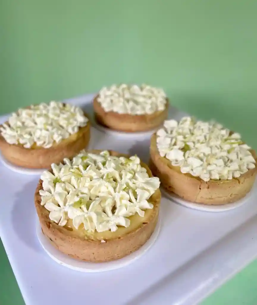 Una base de galleta artesanal, rellena de crema de limón cubierte de chantilly.