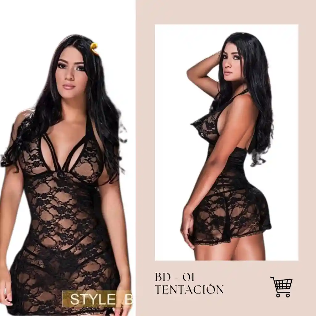 Vestido babydoll sensual en encaje negro floral transparente: escote halter profundo con tiras cruzadas, diseño abierto en V que resalta curvas, malla sheer con patrones intrincados y corte mini que abraza el cuerpo. Talla unica