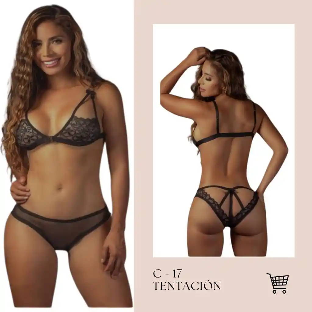 Conjunto sensual en encaje negro floral: brasier con tirantes cruzados en espalda abierta. escote profundo y copa translúcida. Panty de malla sheer con tiras decorativas abiertas que resaltan curvas y glúteos. Talla Unica