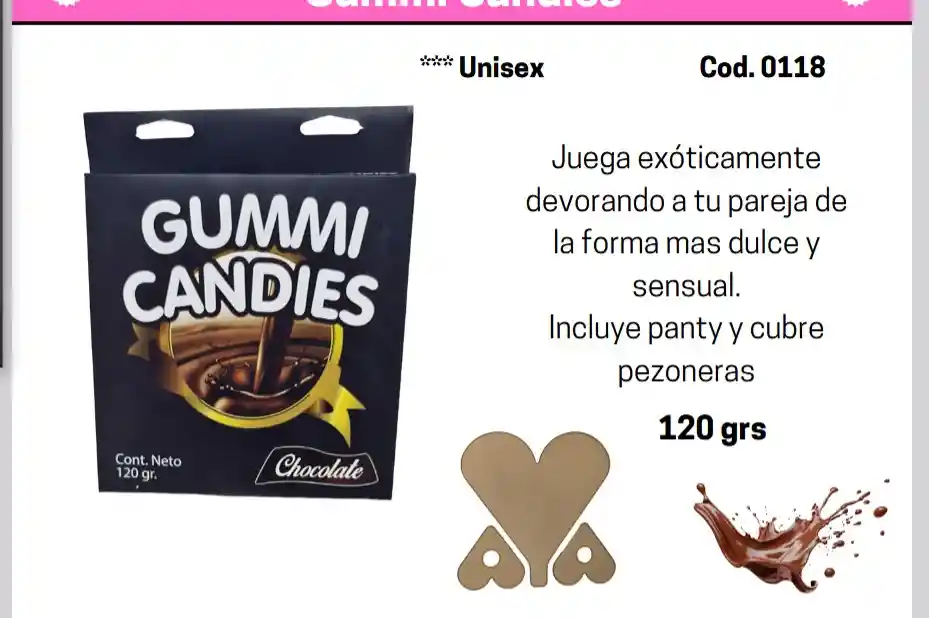 Con Gummi Candies Chocolate, convierte a tu pareja en el postre más irresistible. Este set de lencería comestible unisex incluye un panty y cubre pezones (pezoneras) hechos de suave y sabroso caramelo de goma sabor chocolate. se envía este producto según disponibilidad de diseño, Color Y Sabor