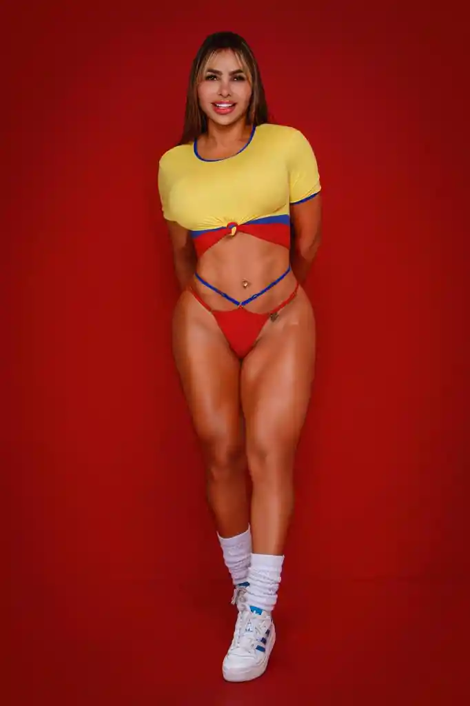 Conjunto corto de dos piezas en tela suave piel de durazno, ideal para resaltar tu figura. Incluye: • Top crop manga corta en color amarillo con detalle de cintura en rojo y azul • Tanga tipo brasileña en rojo con detalles en azul. Material suave y cómodo (piel de durazno) Diseño juvenil y sexy Gama de colores disponible Talla única (ajustable)