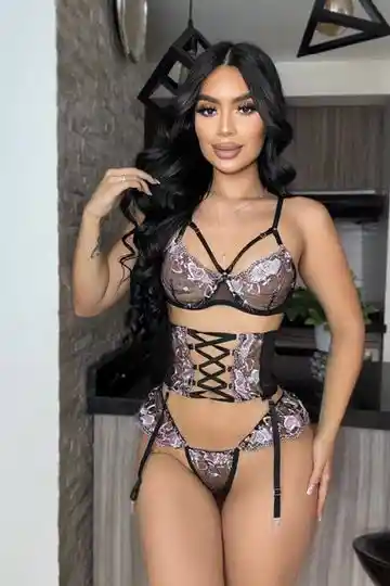 Conjunto de lenceria con corse en encaje color negro con rosa