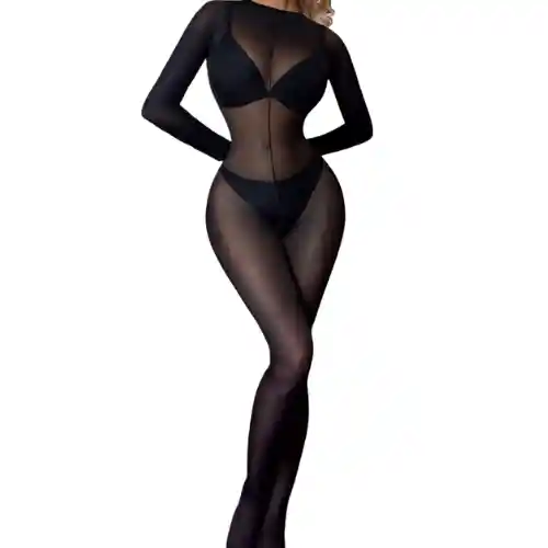 Enterizo completo de malla transparente Manga larga Ajuste ceñido y estilizador Tela elástica y cómoda Color negro clásico Diseño minimalista y sofisticado TALLA UNICA