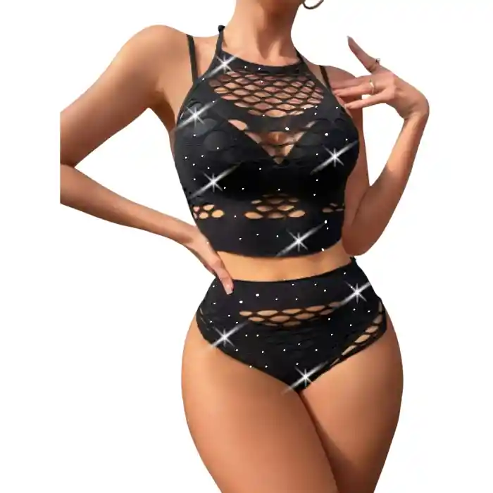 Lencería Malla Erotica Sexy Brillante Dos Piezas Abril