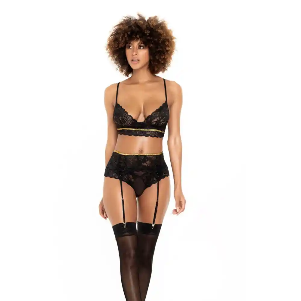 Sensual conjunto de tres piezas en encaje con un diseño sexi y atrevido, perfecto para una noche especial. No incluye medias. Disfruta de experiencias diferentes y agrega un poco de picardía a tu vida. Características: • Referencia: 8625 • Color: Negro con detalles dorados • Material: 83% Poliamida 17% Elastano. • Talla: S/M • Incluye: Top, panty y liguero (No incluye medias) Cuidado y limpieza: Lavar con Abundante agua fría, No meter en lavadora y lavarlo a mano, no planchar y secar a la sombra. Garantía: Por ser una prenda de uso íntimo no se aceptan devoluciones, solo se cubre garantía por defectos de fabricación. Confidencialidad: Tus pedidos se envían en una caja o sobre totalmente sellado opaco, sin ningún tipo de marcas externas. Para nosotros es muy importante tu privacidad.
