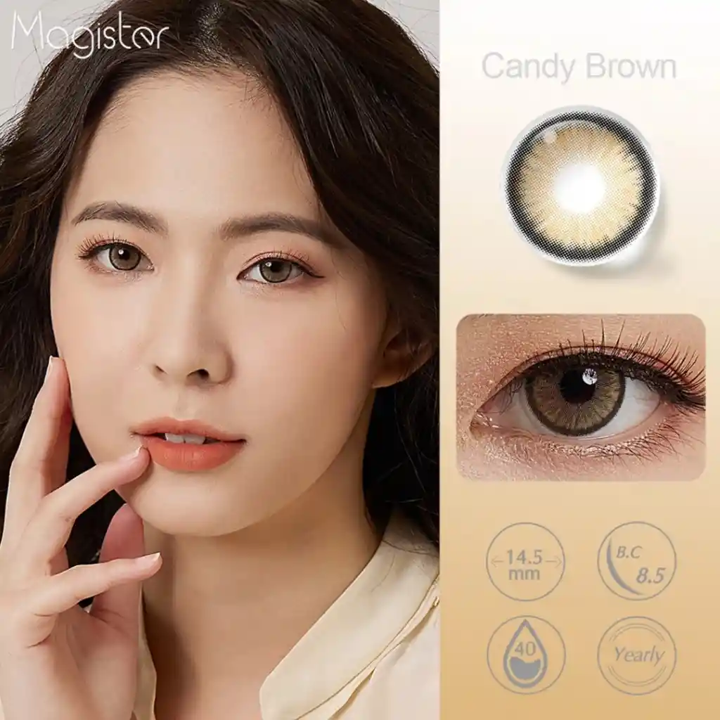 Lentes de contacto de uso cosmético tono: CANDY BROWN Gama: MIEL tamaño: 14.5mm duración: de 6 meses a un año Marca: MAGISTER Excelente calidad, suaves, cómodos, harán resplandecer tu mirada.