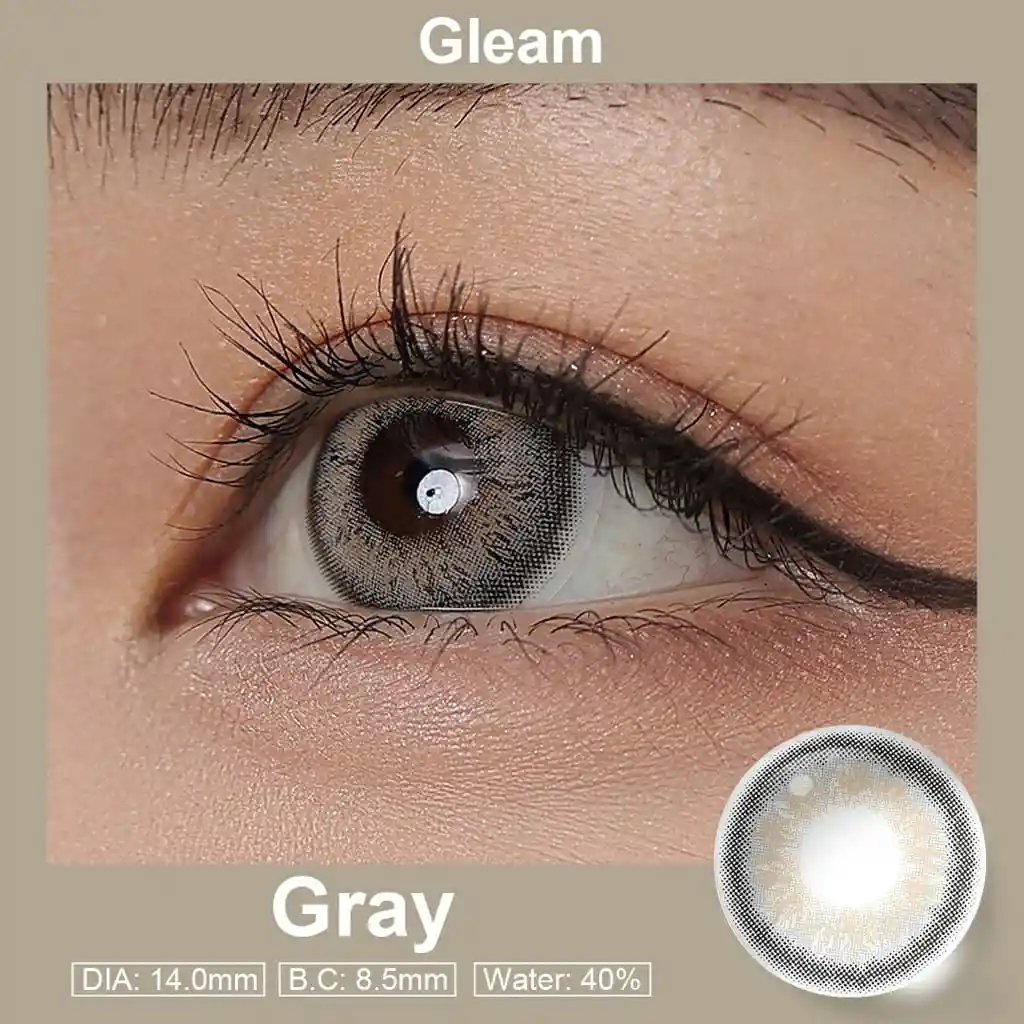 Lentes de contacto de uso cosmético para maquillaje ocasional o diario. Tono: GLEAM GRAY Gama GRIS Efecto natural 40% agua Tamaño: 14mm Durabilidad 1 año Incluye un par de lentes Marca EYESHARE Suaves No irritan No maltratan Nadie podrá resistirse a tus bellos ojos