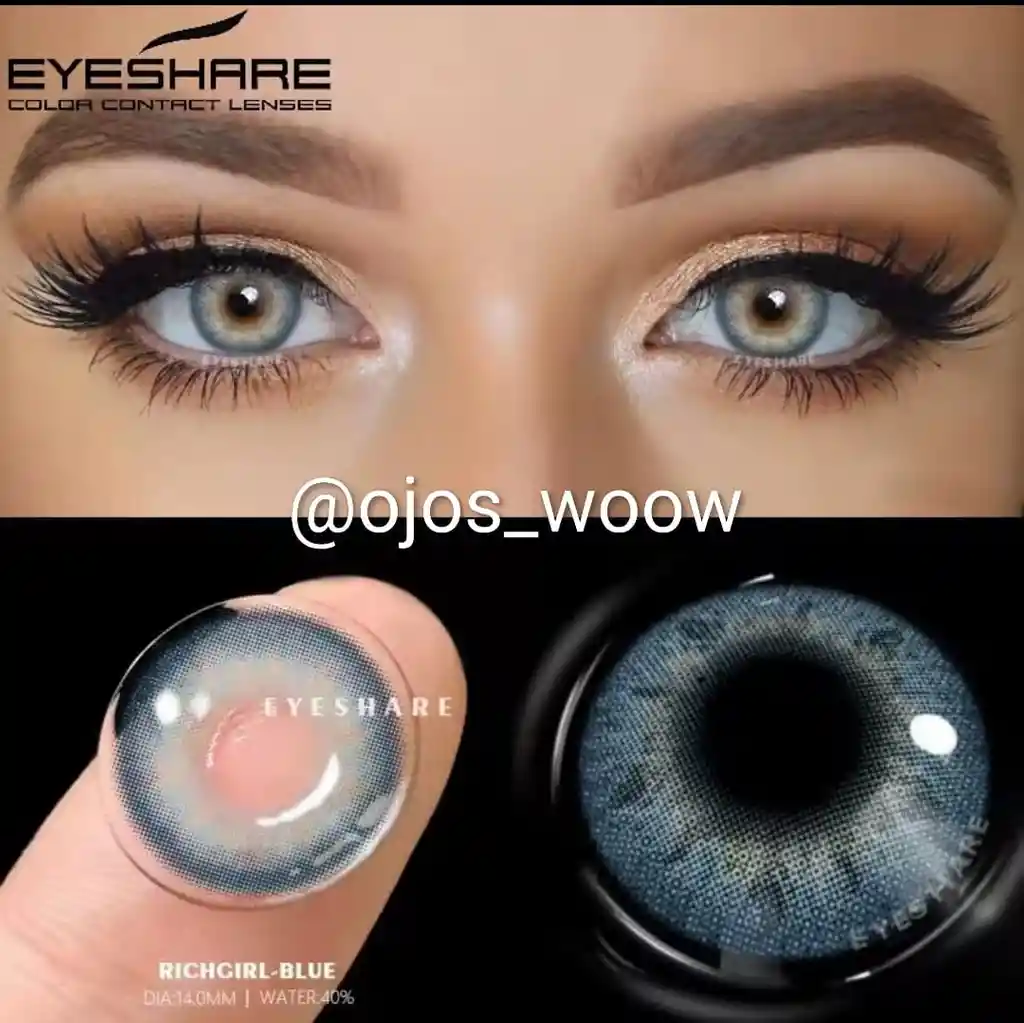 Lentes de contacto efecto natural para maquillaje, ocasiones especiales o uso diario Cosméticos, no medicinales Tono RICHGIRLL BLUE Marca EYESHARE Durabilidad de 6 meses a un año Diámetro 14mm Eleva tu belleza y enamora a primera vista. Mereces tener unos ojos woow. Incluye un par de lentes y portalentes