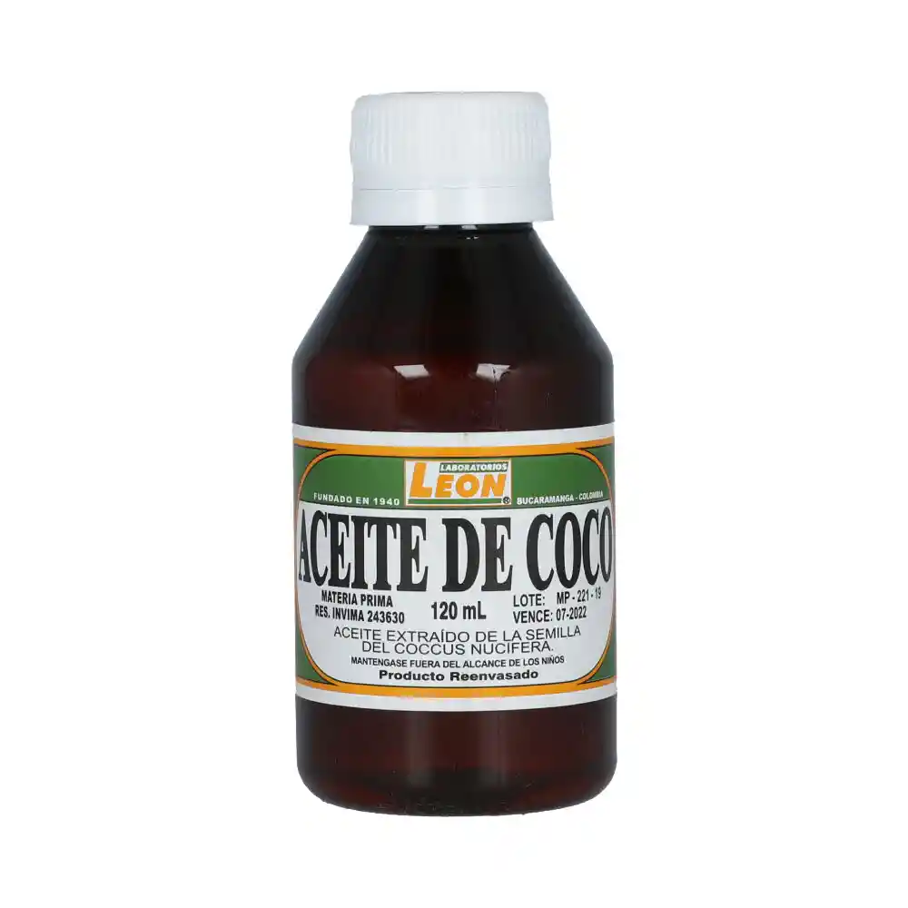 Laboratorios León aceite de coco, presentación en frasco con 120 mL. packing: Frasco