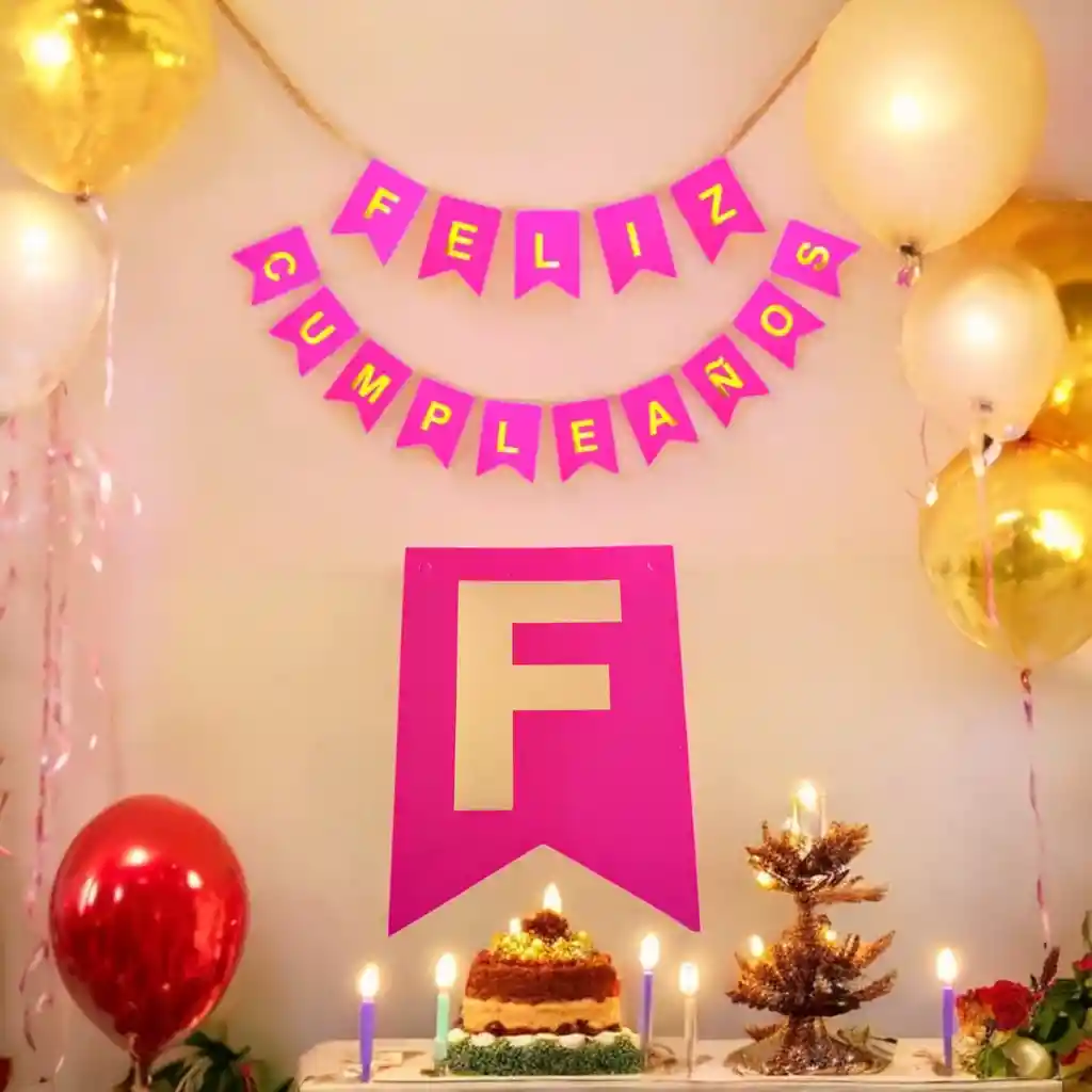 Descripción Banderín Guirnalda Feliz Cumpleaños Fucsia con letras Doradas. Colores Calidos para Decorar tus fiestas u ocasiones especiales. Cada Letra es de una medida de 17 x 12cms y una cinta de 3mts. -Materia: Cartón Especial