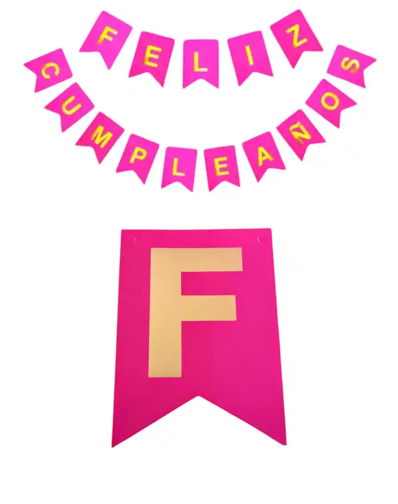 Descripción Banderín Guirnalda Feliz Cumpleaños Fucsia con letras Doradas. Colores Calidos para Decorar tus fiestas u ocasiones especiales. Cada Letra es de una medida de 17 x 12cms y una cinta de 3mts. -Materia: Cartón Especial