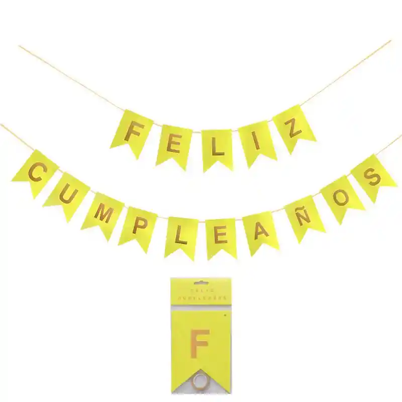Letrero tipo guirnalda feliz cumpleaños en color Amarillo Fluorescente Material: Cartón Tamaño: Varia según qué tan cerca o lejos se dejen las letras Incluye: Cinta de papel para armar letrero.