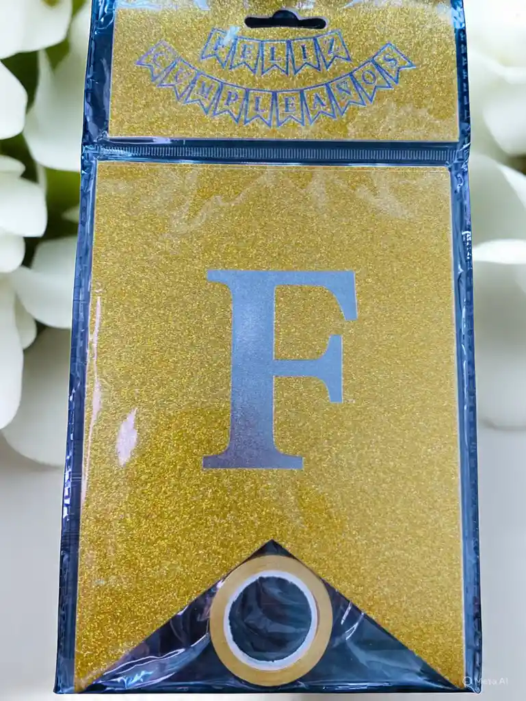 LETRERO FELIZ CUMPLEAÑOS ESCARCHADO TIPO BANDERIN COLOR DORADO
