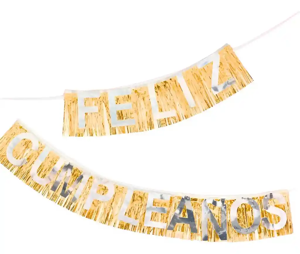 Letrero feliz cumpleaños de flecos dorados con letras plateadas banderines o girnaldas mide 3 metros