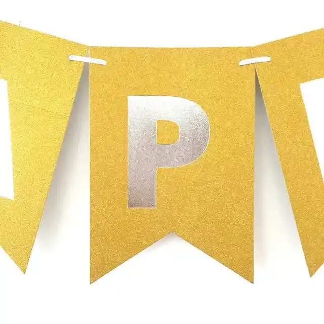 LETRERO FELIZ CUMPLEAÑOS TIPO BANDERIN ESCARCHADO MEDIANO DORADO 16 x 12 CM CADA BANDERIN. LARGO APROX 2MT