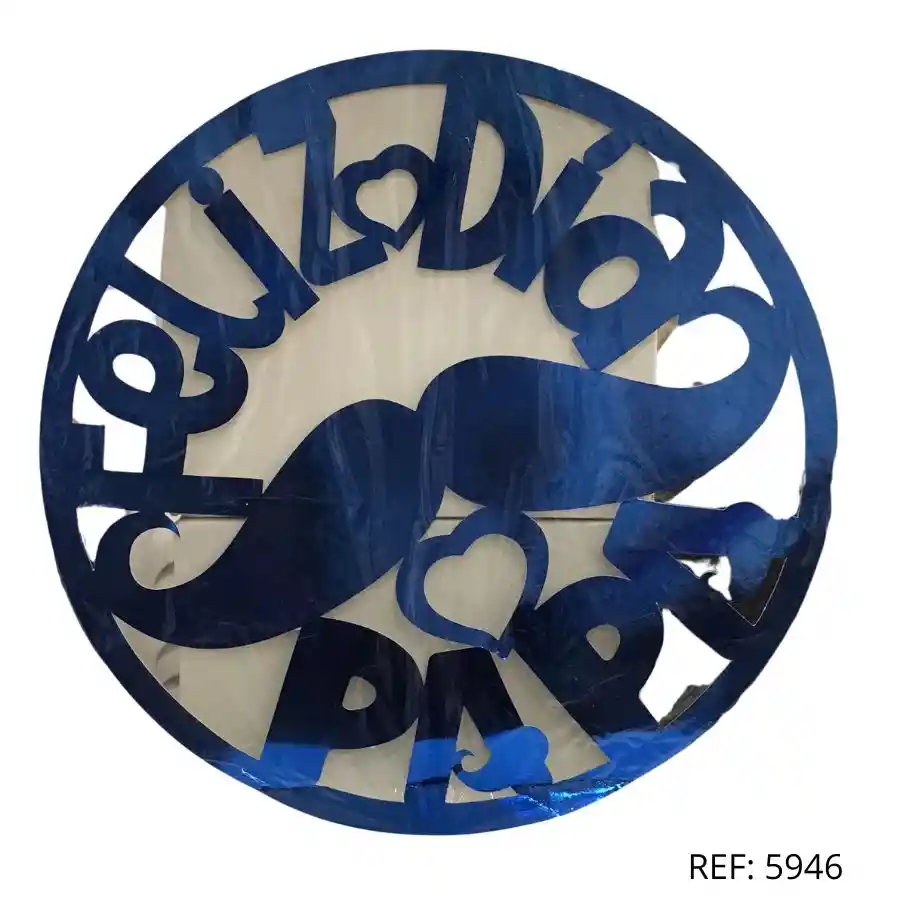 Decoración circular azul metálico con mensaje “Feliz Día Papá”. Perfecta para ambientar con estilo el Día del Padre.