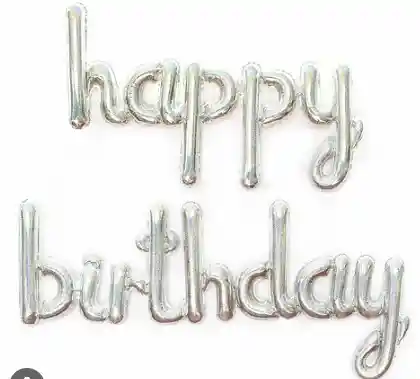 LETRERO GLOBOS BOMBAS DE HAPPY BIRTHDAY EN LETRA CURSIVA METALIZADO PLATEADO