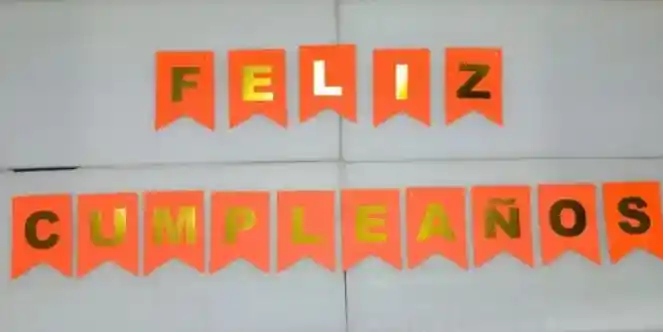 LETRERO GUIRNALDA BANDERIN FESTON FELIZ CUMPLEAÑOS NEON NARANJA CON DORADO