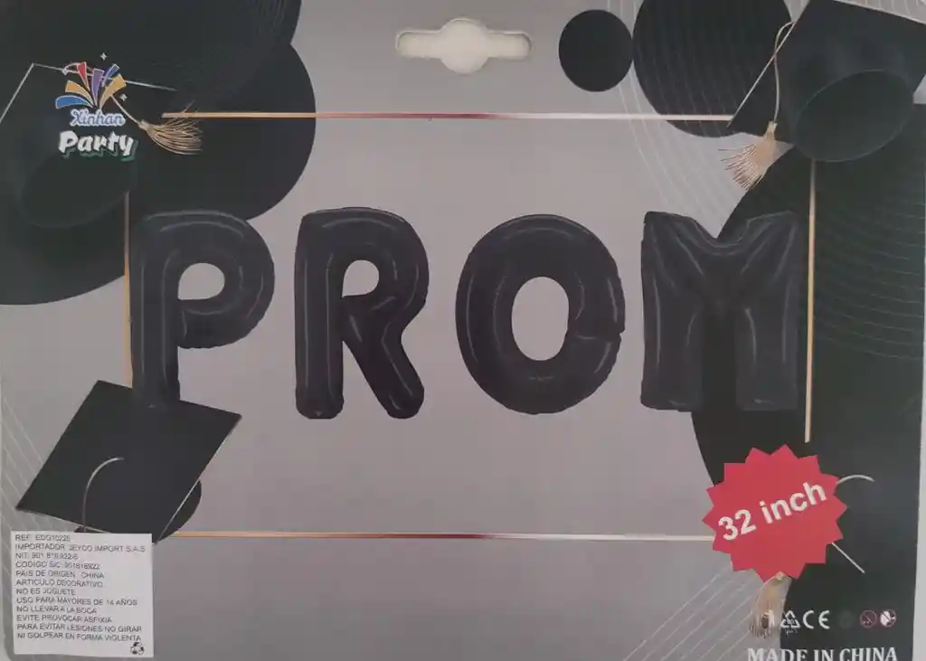 Letrero metalizado tipo globo PROM en color negro sin inflar, cada letra tiene un tamaño de 35 cm de alto. Incluye el pitillo para inflar cada una de las letras.