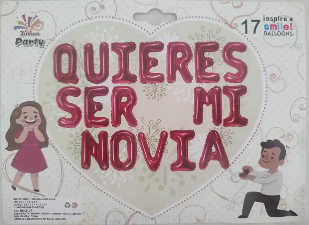 Letrero metalizado tipo globo quieres ser mi novia en color rojo sin inflar, cada letra tiene un tamaño de 35 cm de alto. Incluye el pitillo para inflar cada una de las letras.