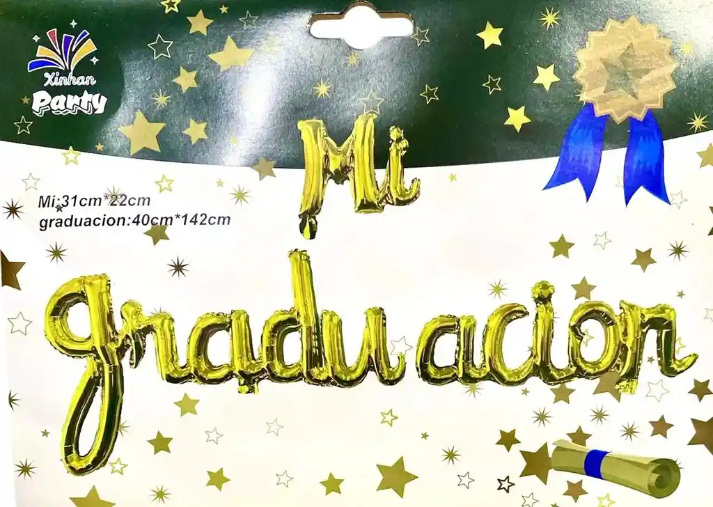 Letrero Mi Graduacion Inflable Dorado Cursivo. Se envia desinflado, el fondo de la imagen solo es decoracion y no esta incluida