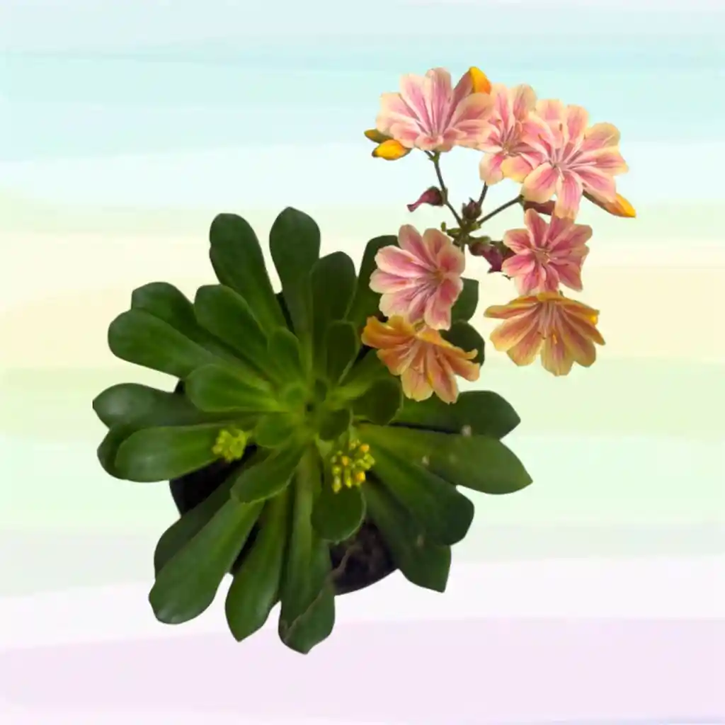 Planta Lewisia con flores tono salmón, presentada en matera, perfecta para espacios frescos y decorativos.