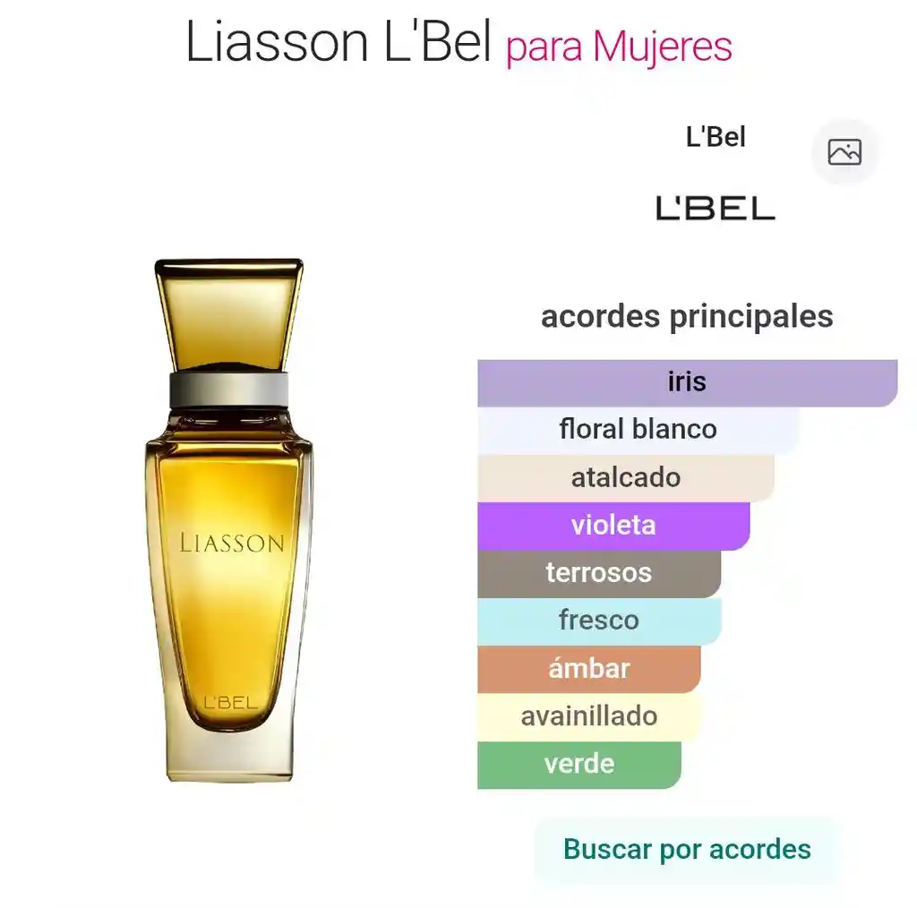 Descripción Liasson de LBel es una fragancia de la familia olfativa para mujeres. Las notas de salida son afrutadas, bergamota y durazno las notas de corazón son iris, lirio de los valles y raíz de lirio las notas de fondo son vainilla, ámbar, sándalo, cedro y almizcle.