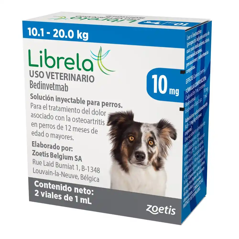 LIBRELA (bedinvetmab) es una solución inyectable para administración en perros de 12 meses de edad o mayores. El bedinvetmab es un anticuerpo monoclonal canino terapéutico expresado a través de técnicas recombinantes en células de ovario de hámster chino (CHO), que neutraliza el Factor de Crecimiento Nervioso (NGF, por sus siglas en inglés). USO VETERINARIO.