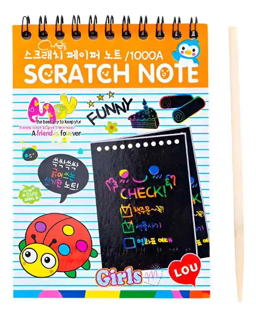 Da rienda suelta a tu creatividad de una forma completamente nueva y sorprendente con nuestro cuaderno de arte mágico para raspar. Cada página de este innovador bloc está cubierta por una superficie negra que esconde un espectacular fondo de arcoíris. Simplemente desliza el lápiz de madera incluido para raspar la capa superior y observa cómo tus dibujos, notas y diseños secretos cobran vida al instante con una explosión de colores vibrantes y llamativos. Es la herramienta perfecta para fomentar la imaginación en artistas de todas las edades, ofreciendo una experiencia de dibujo única, divertida y completamente libre de desorden. Ficha Técnica: Dimensiones : 27 cm x 19 cm Material: Hoja / Cartón Edad apta + 3 años Certificado de conformidad: SL-CS-210044 Referencia: JD1079 ** _Para defectos de fábrica o retractos: \_Por favor revise el producto apenas lo reciba y antes de usarlo. No aplican ley de retracto o defectos de fábrica luego de usar el producto. Se manejan máximo 5 días para reportar defectos de fábrica (por ejemplo, producto funciona mal, piezas faltantes, rotas, etc). Para hacer efectiva la devolución el producto debe devolverse con el empaque original, el cual debe estar en buen estado, incluir todos los documentos y las partes completas y sin daños.