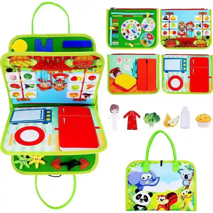 Libro interactivo diseñado para estimular el aprendizaje temprano de forma divertida y práctica. Basado en la metodología Montessori, permite que los niños desarrollen habilidades cognitivas, motrices y sensoriales a través del juego. Contenido del producto: 1 libro de actividades sensoriales tipo Montessori Características del producto: Incluye páginas con cierres, botones, figuras, encajes y actividades de conteo. Favorece el aprendizaje de colores, formas, números y coordinación. Elaborado con materiales resistentes, seguros y suaves al tacto. Diseño portátil con cierre seguro, ideal para usar en casa o durante viajes. Color verde con ilustraciones llamativas que atraen la atención infantil. Beneficios de uso: Desarrolla la motricidad fina y la concentración. Estimula la lógica, la memoria y la independencia. Promueve la exploración sensorial y el aprendizaje autónomo. Especificaciones básicas: Tipo: Libro sensorial educativo Modelo: Busy Book Montessori Color: Verde Material: Cartón grueso y fieltro no tóxico Edad recomendada: Desde 2 años