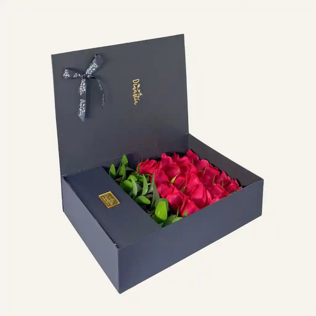 Libro elegante con 24 rosas rojas tipo exportacion y tarejta con dedicatoria.