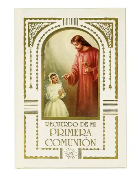 Misal o libro de Primera Comunión de mano para niña. Lo tenemos disponible de 11 cm x 7,5cm, borde dorado con pasta dura.