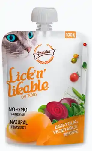 Gnawlers Snack para Gato Lick’ N’ Likable Yema de Huevo y Vegetales 100Gr, están elaboradas con yema de huevo y verduras de origen regional. Se incluyen nutrientes cuidadosamente seleccionados para lograr una palatabilidad óptima. La comida para gatos GNAWLERS Lick’n Likable utiliza ingredientes saludables que incluyen proteínas frescas de origen regional, niveles óptimos de contenido de grasa y absolutamente ningún conservante.
