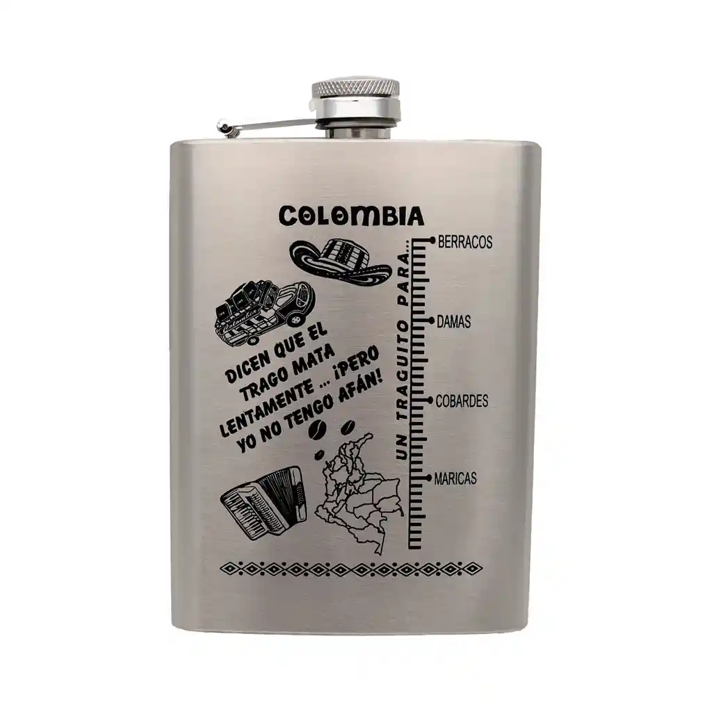 Esta hermosa whiskera o como muchos la conocen cantimplora esta estampada con un mensaje alusivo a nuestra tierra Colombia. El recipiente es en acero inoxidable de 8 onzas con una tapa que se enrosca fácilmente para evitar perdida de líquido, va con un tamaño moderado ideal para bebidas pequeñas. Este tipo de artesanías decorativas marcan tendencia en la actualidad con diseños exclusivos. Ficha Técnica: Dimensiones (Altura x Ancho x Profundidad ) : 12 cm x 10 cm x 2 cm Material del recipiente incluida tapa : Acero Inoxidable Material del Soporte de la Tapa: Metal Capacidad: 8 onzas Términos de garantía: Para defectos de fábrica o retractos: Por favor revise el producto apenas lo reciba y antes de usarlo. No aplican ley de retracto o defectos de fábrica luego de usar el producto. Se manejan máximo 5 días para reportar defectos de fábrica (por ejemplo, producto funciona mal, piezas faltantes, rotas, etc). Para hacer efectiva la devolución el producto debe devolverse con el empaque original, el cual debe estar en buen estado, incluir todos los documentos y las partes completas y sin daños. Los cuidados y recomendaciones para mantener un producto en buen estado son los siguientes: No aplicarle perfumes ni cremas directamente, no mojarlos, no dejarlos caer y procurar limpiarlos para retirar suciedad.