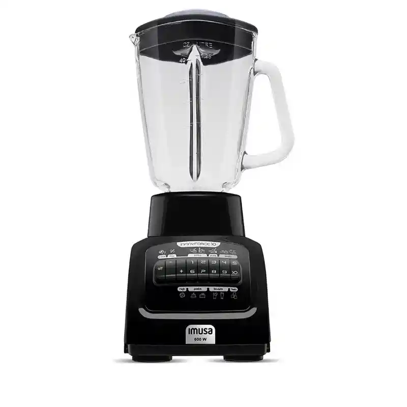 LICUADORA IMUSA INFINY FORCE 10 VELOCIDADES NEGRO Infinyforce te da una infinidad de recetas y sabores para que le des gusto a tu paladar y al de toda tu familia. Batidos, licuados, cremas, salsas y mucho más, es lo que podrás preparar con la facilidad de sus 10 velocidades, para que logres la consistencia ideal que tanto deseas en compañía de sus 6 cuchillas. ¡Pídela ahora y recíbela en tu hogar! . • Vaso de Vidrio con capacidad de 1,2Litros para que licúes tus deliciosas bebidas para tu familia, a tu gusto y velocidad. • 10 Funciones + Pulso garantizando un control total de tus preparaciones. • Potencia de 600 Watts, ahorrando tiempo y permitiendo mejores resultados. • 6 Cuchillas en acero inoxidable con tecnología powerlix