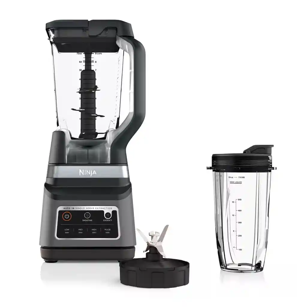 Diseñada para quienes buscan rendimiento y practicidad, la Ninja® Professional Plus DUO® combina una licuadora de alto rendimiento y extractor de nutrientes en un solo equipo. Con un motor de 1400 watts de potencia pico y las exclusivas cuchillas Total Crushing®y Pro Extractor®, tritura hielo y procesa ingredientes densos en segundos. Su jarra de 72 oz (2.1 L) es ideal para preparar grandes cantidades para toda la familia, y sus vasos individuales con tapa Flip Top hermética te permiten llevar tus batidos nutritivos a donde vayas. Incluye 2 programas Auto-iQ® que hacen todo por ti con solo tocar un botón, además de 4 velocidades manuales:baja, media, alta y pulso, para un control total. Moderna, potente y multifuncional. ¡Prepara smoothies, sopas, salsas y mucho más sin esfuerzo! incluye : Base Motor de 1400 vatios. Jarra XL 72oz. con tapa y pico de vertido. Cuchilla de trituración total Ninja. 1 Vaso de 700 ml. 1 tapa Sip Seal. Cuchillas de Ninja Pro. Recetario.
