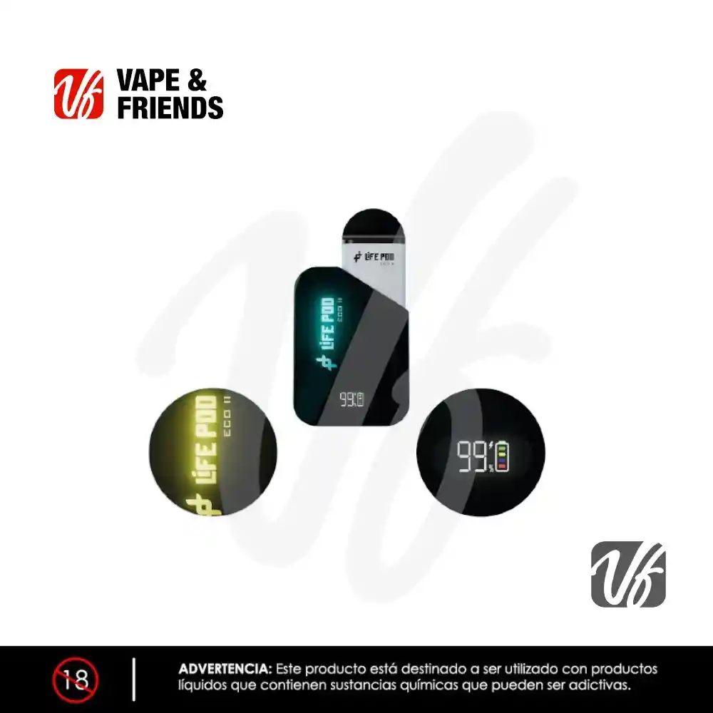 El LifePod Eco II 10k kit Completo es el dispositivo ideal para aquellos que buscan una experiencia de vapeo duradera y de alta calidad. Este kit incluye tanto el dispositivo como un cartucho LifePod Eco, brindando una solución todo en uno para empezar a disfrutar de hasta 10,000 inhalaciones con cada uso. La batería de 650 mAh garantiza una larga autonomía, permitiéndote usarlo durante horas sin preocuparte por recargarlo constantemente. Además, es compatible con los cartuchos LifePod Eco de 5000 y 8000 puffs, lo que añade flexibilidad a tu experiencia de vapeo. Este dispositivo destaca no solo por su rendimiento, sino también por su estilo personalizable. El LED RGB integrado permite elegir entre múltiples colores, dándole un toque moderno y atractivo a tu vape. Además, cuenta con una pantalla que muestra el nivel de carga de la batería, por lo que siempre sabrás cuándo es el momento de recargar. Es un dispositivo diseñado para ofrecer comodidad y estilo en cada uso.