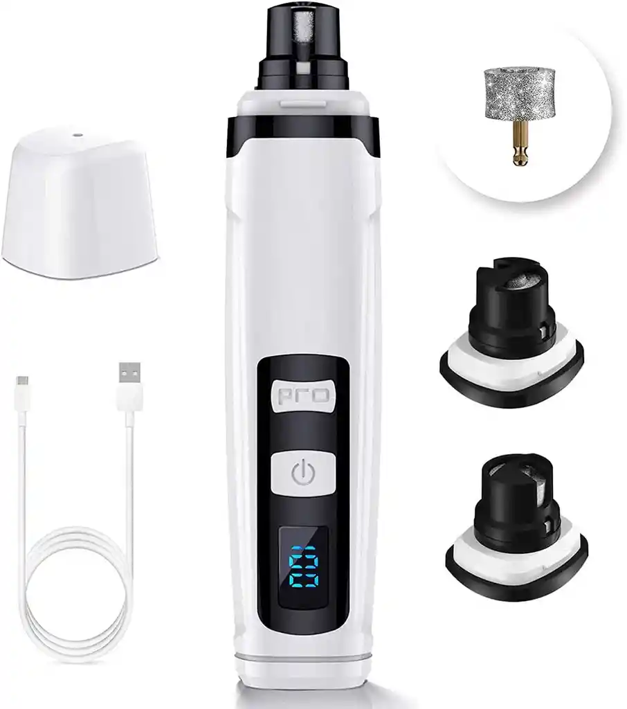 con pantalla LCD actualizada, recargable de 2 velocidades, con limas de repuesto, molinillo de uñas para mascotas sin dolor para perros y gatos pequeños y medianos. limadora de diamante para un corte seguro y preciso: esta lima de uñas para perro o gatos utiliza un cabezal de molienda fino, más suave y seguro. Las mascotas lo aceptarán más fácil con comodidad. También puedes tener un bonito cuidado de uñas de mascotas en casa. Eficiente con 3 puertos de molienda. Este molinillo de uñas para perros tiene ajustes de alta y baja velocidad con una velocidad de motor súper potente de 3,5 V que garantiza una molienda rápida, eficaz y profesional. Los 3 puertos de molienda se pueden utilizar en función de conmutación para uñas de perro grandes, medianas y pequeñas. Silencioso, baja vibración. Esta lima de uñas para perros ha sido probado en muchas mascotas y a tus perros les encantará este molinillo de uñas para perros. Tiempo de espera ultra largo y visualización de energía de la batería. Equipado con cargador USB. El molinillo ligero es fácil de sostener y usar. Compra sin preocupaciones: esta lima de uñas es un gran regalo para perros y gatos, y garantizamos que te encantará. Además, tenemos una rueda de lima de repuesto, por lo que puedes reemplazarla en cualquier momento fácilmente. Si tienes alguna pregunta sobre nuestro molinillo de uñas para mascotas, no dudes en ponerte en contacto con nosotros. La avanzada pantalla LCD de energía de la batería, para que el cliente pueda ser claro sobre la capacidad de la batería del molinillo de uñas de perro y gato, prepárese para cargar con anticipación. Interruptor avanzado de 2 velocidades Nuestra lima de uñas para perro tiene dos velocidades, enciende el botón de interruptor, simplemente pulsa el botón PRO para ajustar la velocidad que deseas alta y baja. tiene un poder fuerte que puede moler fácilmente y rápidamente las uñas del perro, allí reduciendo el riesgo de sobrerecorte. Recargable por USB y portátil. la lima de uñas inalámbrico para mascotas tiene una batería integrada de 2200 mAh, que se puede cargar completamente después de 4 horas y se puede utilizar durante 4 horas. El adaptador de alimentación no está incluido, por favor, conecta el adaptador de teléfono / alimentación móvil / portátil.