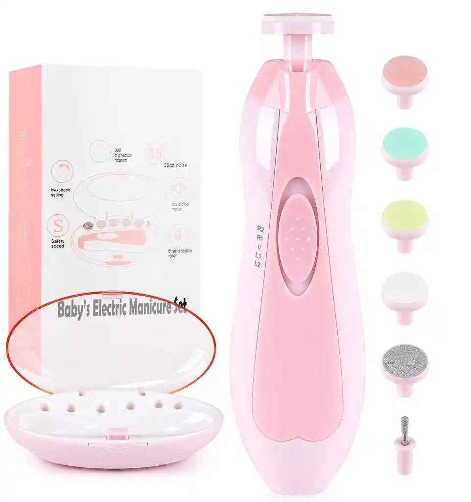 • Estuche rígido con tapa traslucida. • 6 Limas de pulido/cabezales de corte: - Amarillo para bebés de 0 a 3 meses - Rosa para bebés de 4 a 11 meses - Azul para bebé de al menos 12 meses - Blanco es adecuado para pulir. - Limas metálicas plana y cilíndrica sugeridas sólo para manicure en adultos. • 2 velocidades. - R1 baja velocidad en sentido de las manecillas del reloj. - R2 alta velocidad en sentido de las manecillas del reloj. - L1 Baja velocidad en sentido contrario de las manecillas. - L2 alta velocidad en sentido contrario a las manecillas. • Rotación bidireccional. • Nivel de sonido: 35 decibeles • 2 niveles de luz LED • Requiere 2 AA (no incluidas) * No usar prolongadamente por más de 10 minutos. * Indicado sólo para uso en seres humanos. * Contiene piezas pequeñas, usar bajo la supervisión de un adulto responsable. *No dejar al alcance de los niños. *Leer el manual de uso.