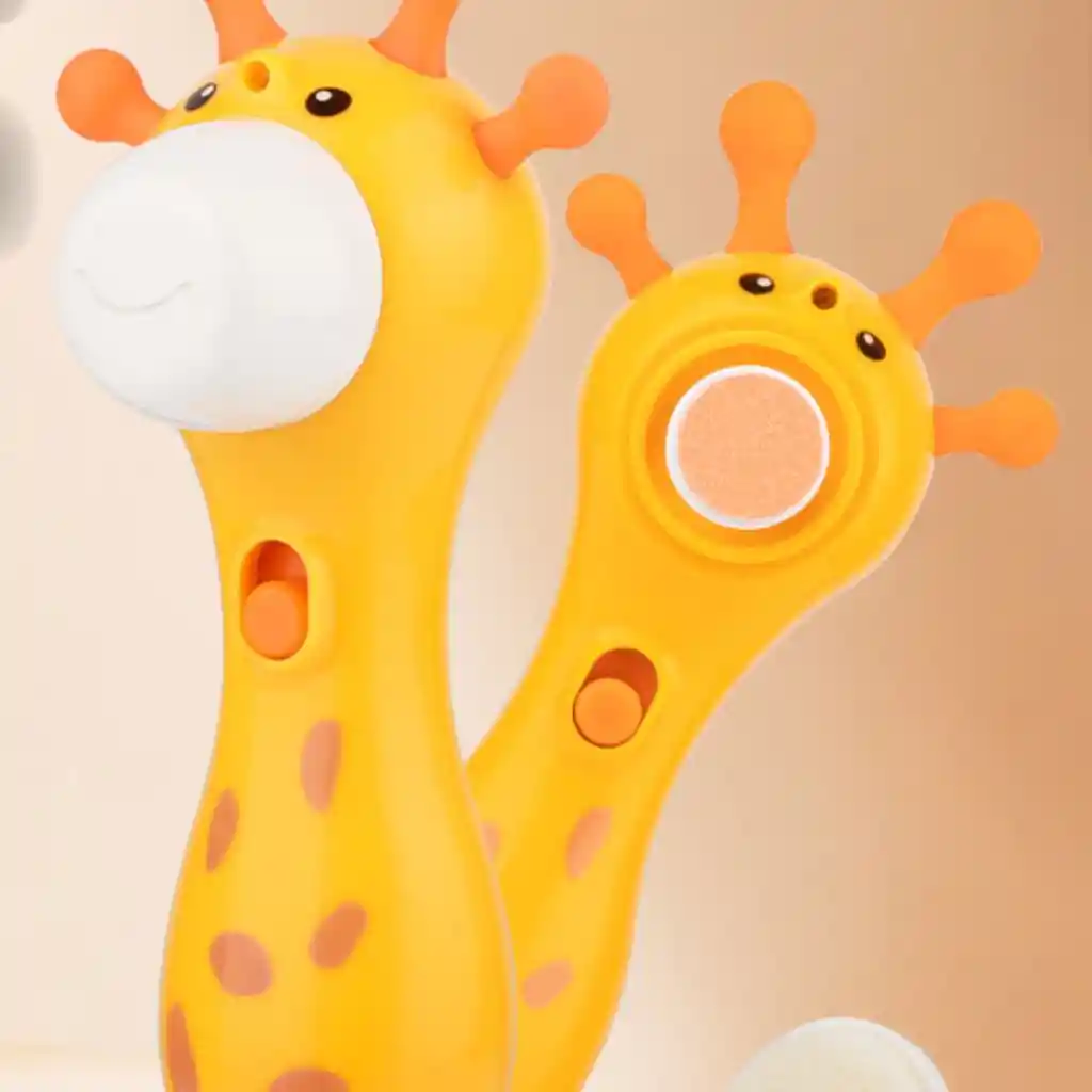 Lima Eléctrica de Uñas Para Bebés con forma de jirafa, diseñada para un cuidado seguro y suave. Incluye múltiples cabezales pulidores intercambiables de diferentes colores para adaptarse a las distintas etapas de crecimiento del bebé (desde recién nacidos hasta más de 12 meses). El dispositivo es seguro al tacto, deteniéndose al contacto con la piel para evitar lesiones. Cuenta con rotación de 360 grados y funciona de manera silenciosa para no asustar al bebé. Ayuda a prevenir arañazos al mantener las uñas suaves y cortas de forma profesional en casa.