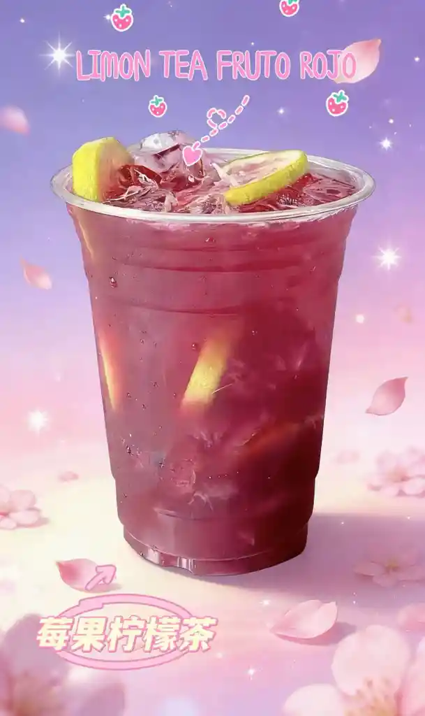 Esta es una bebida hecha de té negro, limón, fresa, mermelada y azúcar (las personas que son alérgicas a los alimentos anteriores no deberían comprarlos. Las flores son solo decoraciones y no deben comerse). La fruta de la imagen se ajustará de acuerdo con el agua dulce del día.
